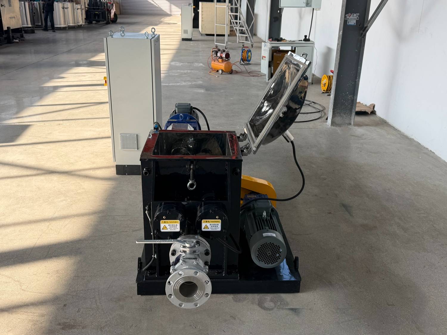 A6: El mezclador funciona con un motor Siemens de 2.2 kW con un inversor ABB , proporcionando control de frecuencia variable. Las velocidades de la cuchilla son ajustables: 0–42 rpm (cuchilla rápida) y 0–35 rpm (cuchilla lenta).